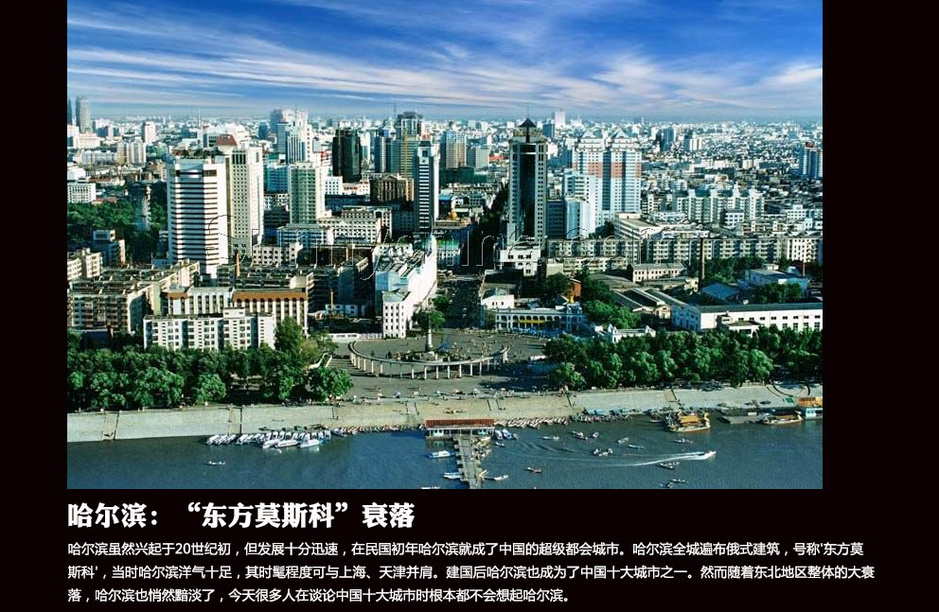 哈尔滨虽然兴起于20世纪初,但发展十分迅速,在民国初年哈尔滨就成了中国的超级都会城市。哈尔滨全城遍布俄式建筑,号称'东方莫斯科',当时哈尔滨洋气十足,其时髦程度可与上海、天津并肩。建国后哈尔滨也成为了中国十大城市之一。然而随着东北地区整体的大衰落,哈尔滨也悄然黯淡了,今天很多人在谈论中国十大城市时根本都不会想起哈尔滨。