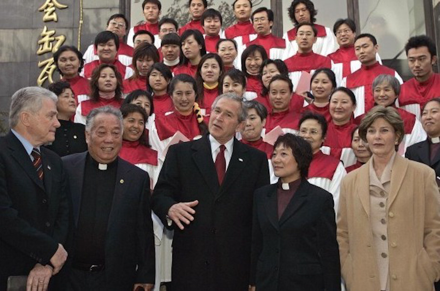 2005年11月20日,北京,美国总统小布什与夫人劳拉在参加完弥撒之后与教会成员合影。